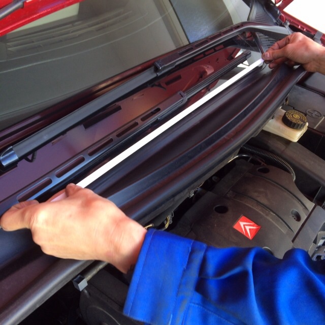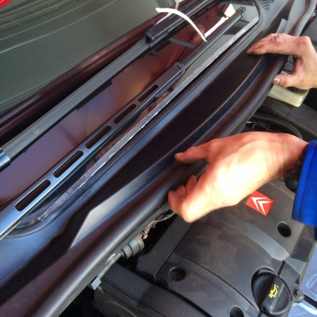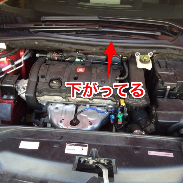 次は、フロントのボンネットとフロントガラスの間のバイザーが外れていたので修理します。