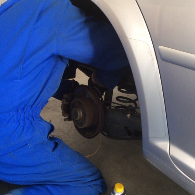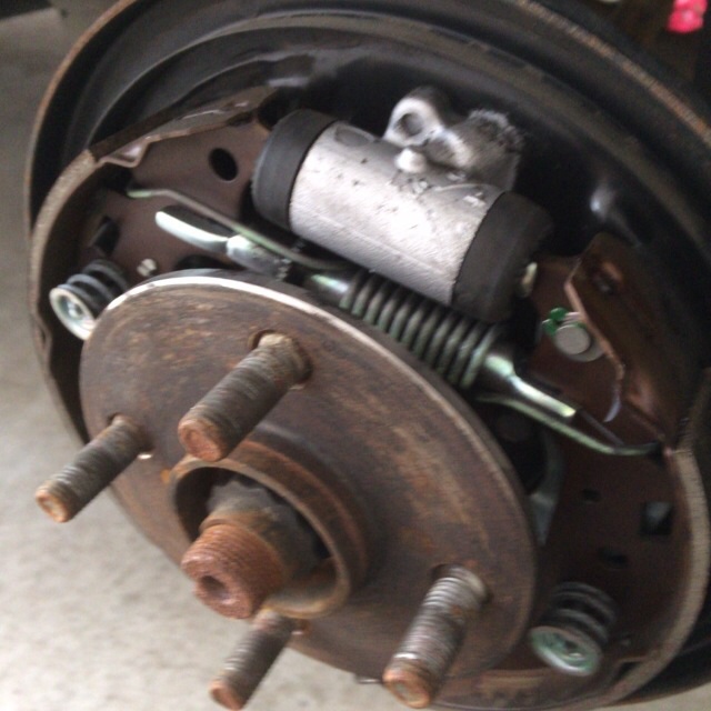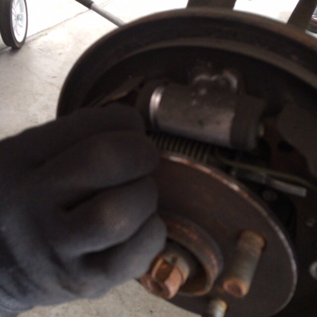 写真はリアブレーキ。この車はリアがドラムブレーキなので、分解してブレーキクリーナーを使って清掃。